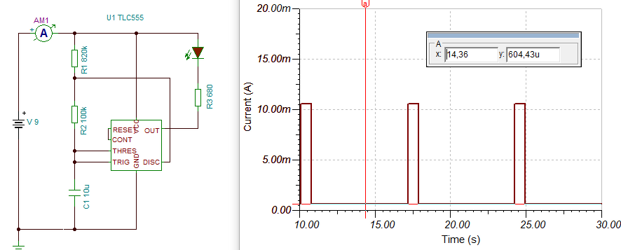 Hogy a villogások közötti idő 5..7sec legyen, az megoldható, a 22µF-os kondi 47µF-ra cseréjével. De ez a kapcsolás a Led felvillanásához az időzítő kondiban tárolt energiát használja fel. Tehát ott nem lesz a felvillanás ideje 1 sec, tekintve hogy a PUT a kondi energiáját süti rá a Led-e. Ez jóköra felvillanást okoz, de időtartamban ez sokkal rövidebb. De pont ennek a megoldásnak köszönhető, az extrém kis fogyasztás. Ha ragaszkodsz a 5..7s/1s időzítéshez, akkor más utat kell választani. Pld. egy CMOS 555 személyében. Ez elvégzi az időzítést és meg is tudja hajtani a Led-et. Ha megnézed a grafikont, láthatod, hogy az Ic alapfogyasztása kb. 600uA és a Led árama kb. 10mA. Mivel az időzítés kb. 1:10 arányú, a Led átlagáram fogyasztása is ennek megfelelően csökken. Így átlagban kb. 2mA fogyasztás jön ki. (Fogalmam sincs, ma egy 9V-os elem kapacitása mekkora.) Így ha a 9V-os elem 200mAh kapacitású, akkor kb. 100 óra üzemidőre számíthatunk. De mint látható, itt a kondiban tárolt energiát, csak az időzítésre használjuk, és a Led-el sorba kötött áramkorlátozó ellenálláson is veszteség van. De ha a 9V-os elem helyett egy Liion akksit használnál, akkor annak 2Ah kapacitásával az üzemidő, kb. 1000 órára nő.
