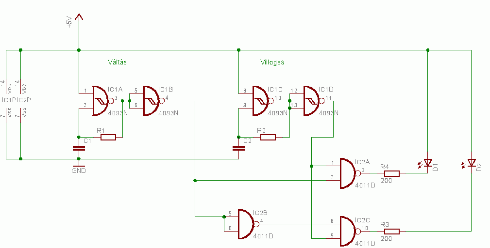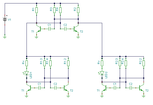 Egyszerűen szólva, egy egyszerű multivibrátor (lsd. feljebb) ami NEM a LEDeket, hanem EGY MÁSODIK multivibrátor TÁPJÁT kapcsolgatja. Ha a Q-n + van, az villogtat egy LED-et. És ha a Q' van + akkor meg megy egy másik multivibrátor ami meg egy másik ledet villogtat. Így meg lehet csinálni, szerintem működne is. Értitek, hogy gondolom, vagy rajzoljak egyet? Nem biztos hogy magyarázni jól tudok...