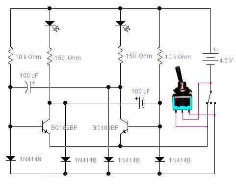 Gondolom arra gondolsz amikor két 9 voltos eleme és azon felépitve egy fél astabil multivibrátor? mikos külön vannak akkor folyamatosan világitanak mikor össze "ölelkeznek" az az éritnekeznek akor elkezdenek felváltva vilogni! ha arra akor megtalálod az alapkacsolásokban!