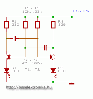 Az ellenállásokat, a tápfeszültség és a Led-áram szerint kell megválasztani. (Utáp-Uled)/Iled ( A Jani megoldásánál, a tranzisztorok kollektor ellenállása egyben a Led előtétét ellenállás szerepét is betölti) De ahogy Jani is rajzolta, ellen ütemű meghajtás értelmesebb, ha a Led áram nagyobb, vagy többet szeretnél sorba kötni. Persze lehet más IC-s megoldást is használni, csak a villogó kimenetére egy invertert kapcsolni. Ez lehet tranzisztoros, vagy akár IC-s is. Szóval a konkrét megoldást úgy lehet helyesen kiválasztani, hogy ha ismert az igény. Tehát hány Led-et akarsz sorba kötni és mekkora Led-árammal üzemeltetni. Mert pld a tápfeszültséget is ez alapján kell megválasztani. Hiszen a tápnak illik magasabbnak lenni, mint a soros Led-ek nyitófeszültségének összege. üdv! proli007