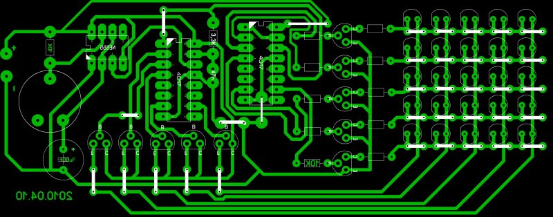 A kész prototípuson is csak "sima" LED-mátrix látszik. S valóban a kapcsolás " Csibéknek kecskeól. " De a LED-mátrix - 555 - 4017 -es kapcsolások gyakorlására tökéletesen megfelel.