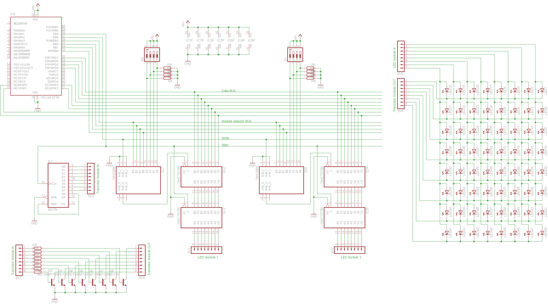 Éppen egy nagy LED-matrix-ot tervezek, és segítséget szeretnék kérni, mégpedig, hogy a mellékelt kapcsolás működőlépes lenne-e? A PIC programjával vezérelném az egészet, azért van ott két szintű 74HCT573, mert az első körben beírom mindegyik modulba az adatokat a 74HC85 segítségével, és amikor a CD4017 vált egy sort, akkor a második 74HCT573 -k pedig kiírják az adatot a kimenetre... Gondoltam még shift regiszterekre, de szerintem programilag egyszerűbb bájtokat küldeni (elméletileg) ![]() Üdv.: TLaci