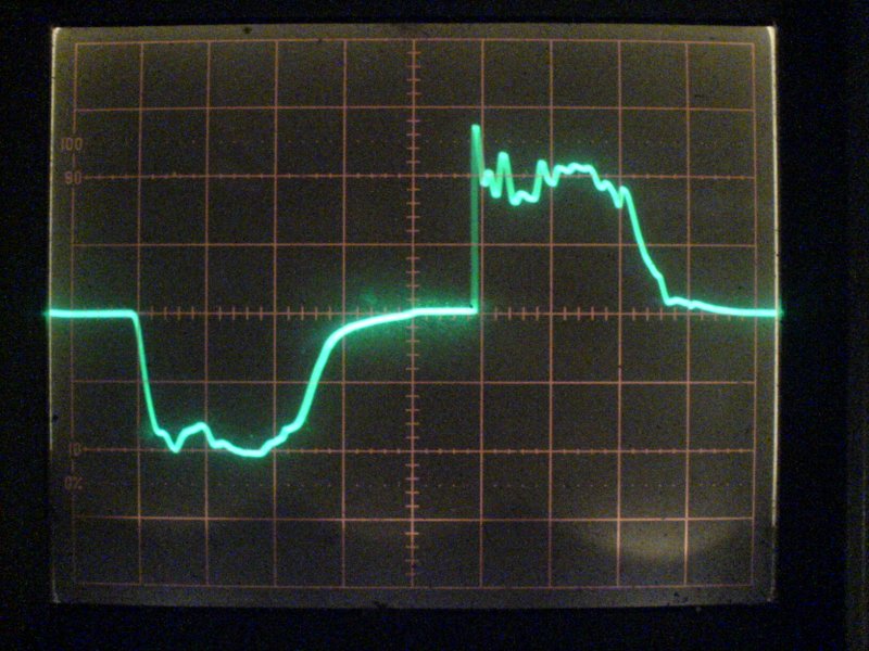 Készítettem egy kapcsolást (DSC00334.JPG), ahol 13 ledet kötöttem sorba, velük párhuzamosan egy diódát, majd sorba egy 1µF-os kondit és egy 1.1K-s ellenállást. Majd mértem a kondenzátoron a feszültséget szkóppal (DSC00335.JPG). 2V/osztás, az egészet pedig 30V-ra kötöttem. A másik szkóp képen (DSC00336.JPG) egy 30 ohmos ellenálláson néztem a jelalakot, az sem szimmetrikus.