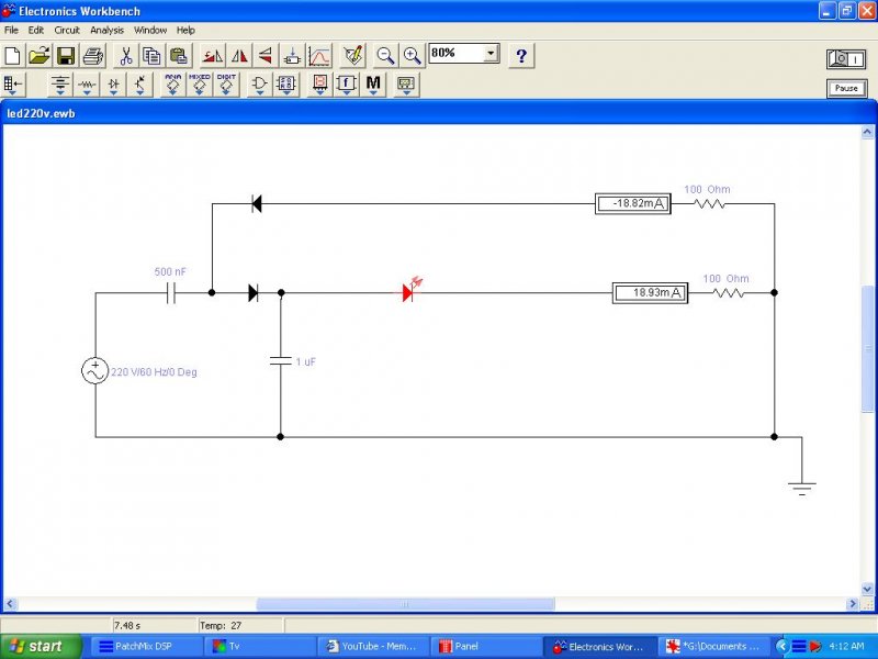 Figyeld az aram erteket a szimulaciobol kimasolt kepekbol. A soros kondenzator reaktanciajatol fugg az aram nagysaga. 500nF esetebe kb 0-tol 300 Ohm-ig soros ellenallasal ,kb 21mA marad az aram egy egy agban es valtoaramban ezek osszege (egyeniranyitas elott) 42mA.