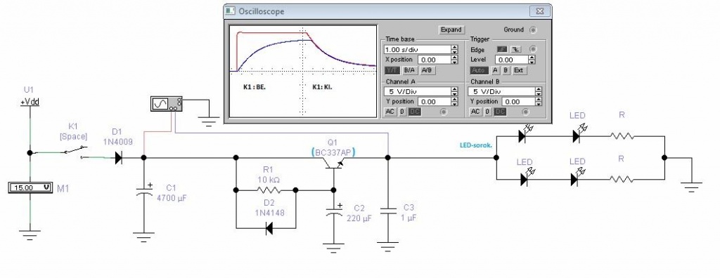 Ez az áramkör két részre bontható. 1: Pufferkondenzátorból ( C1, D1 ). A C1 a kikapcsolási időt ( elhalványulást ) állítja be. A D1 dióda a tápegységet védi a ( hátbatámadástól ) kimenet visszatáplálásától. Egyes tápegységek tönkre is mehetnek ettől... 2: A Tranzisztoros emitterkövetőből ( Q1, R1, D2, C2, C3 ). Az R1 - C2 a bekapcsolást ( kigyulladást ) állítja be. A C3 a kimenő feszültséget szűri. A Q1 tranzisztornak a LED-sorok áramát el kell viselnie. Megéri egy kicsit túlméretezni és hűtőfelületre szerelni. A D1 diódának is el kell viselnie a C1 pufferkondenzátor áramát.