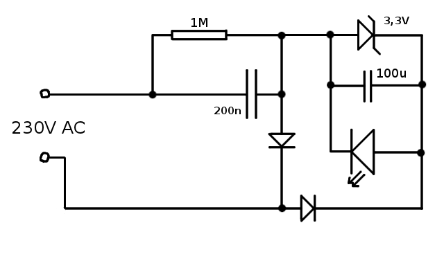 A 470nF-ot újraszámoltam, mivel ha pufferelek akkor nem lesz félhullám-hatás. A linkelt kapcsoláson látható, hogy két dióda (Az egyik a LED!) van párhuzamosan, de ellenirányba kötve, így amikor az egyik káros ellenfeszültséget kapna, akkor a másik kisöntöli, és eközben működik az azon átfolyó árammal. És én az egyik ágba sorossan beraktam egy párhuzamosan kötött zenert&pufferkondit&ledet, a sima diódát azért nem váltja most ki a led, mert enélkül a levágott félhullámok ideje alatt a pufferkondi töltése visszasülne a hálózatba. A feszültség a pufferkondenzátoron és a leden nem tud 3,3V fölé (lényegessen) menni, mert ott söntöli a zener. Külömben órainga kivilágításra gondoltam, aminél pedig mivel mozog szeintem még a gräetz-hidas 100Hz-en vibráló megoldás is látszódó lehet. És bevallom, nem vagyok glimmlámpa szakértő (ezért is döntöttem a LED mellet) a legkisebb mértékben sem, de annak még valahogy irányítani kellene a fényét, valamint úgy tudom, hogy az is vibrál 100Hz-en.