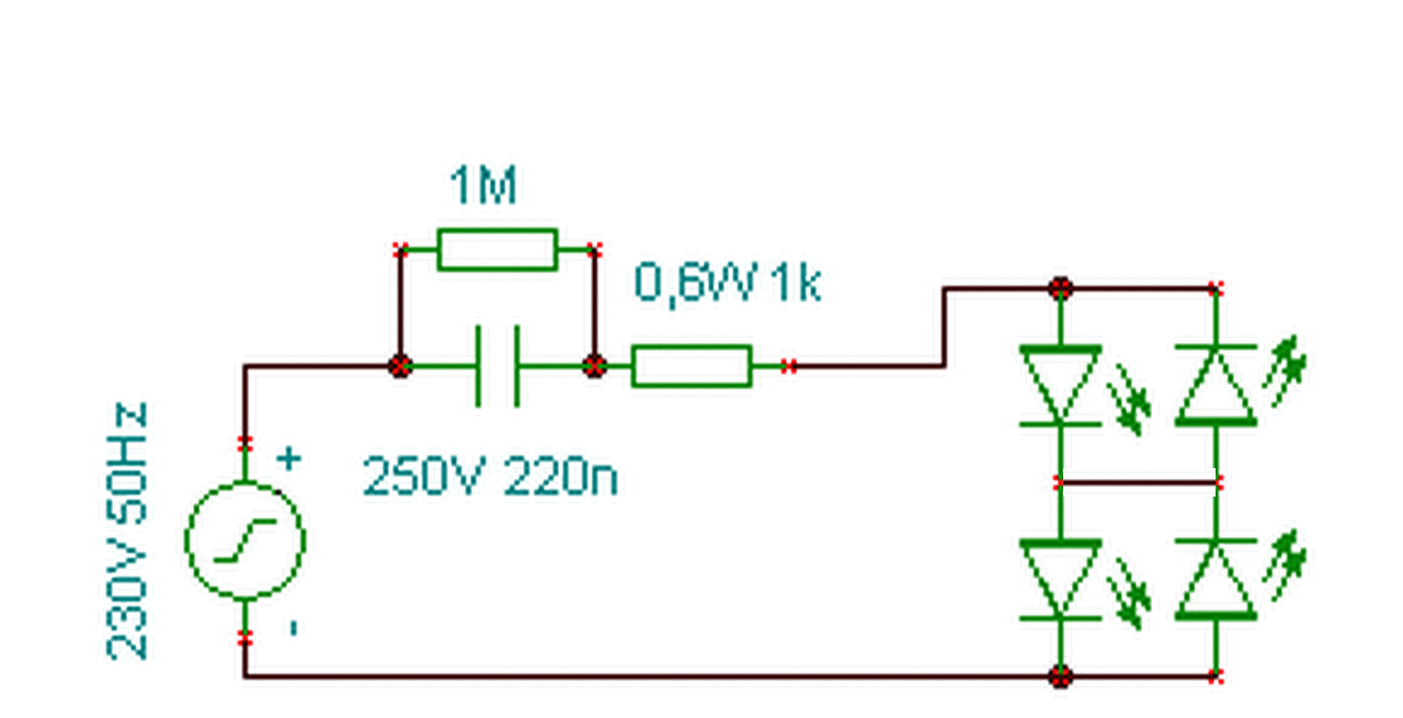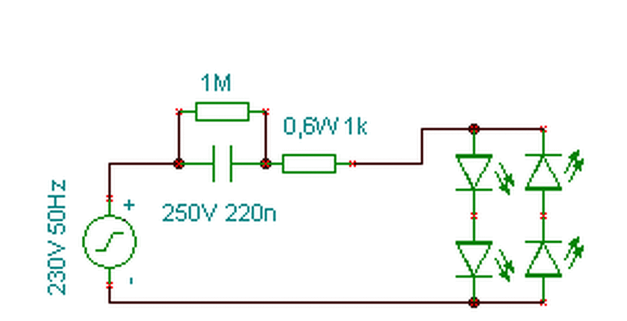 Szia! A jelenlegi szimulációban a nálam mért 238V-os hálózati feszültségen 16,4mA volt a maximum ami a ledeken átfolyt. Szerintem kicsit növelni kellene az áramot a nagyobb fény érdekében, mert ez alig pislákolna. Igaz nem robban fel, tehát megépíthető. A szimulátorban, ha 330nF-ot állítottam be, akkor felment 24,4mA fölé az áram. A ledeket azonban nem védi semmi a fordított polaritás ellen, márpedig 5V-nál többet nem nagyon szoktak szeretni. Most 2.83V-ot láttam 330nF-nál. 220nF-nál 2.79-et. Így elvileg bírhatják, de ha a kondi kiszárad - robbannak. Egy soros dióda lehet, hogy nem ártana mindkét polaritás körében.