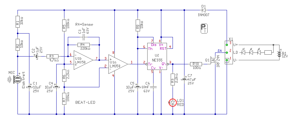 Szerintetek a mellékelt kapcsolás működőképes? A zene ütemére szeretném villogtatni a ledet. Amennyiben működik hová érdemes kötni ilyen értékkel? A hangszóróra lehet a végfok után? Köszi