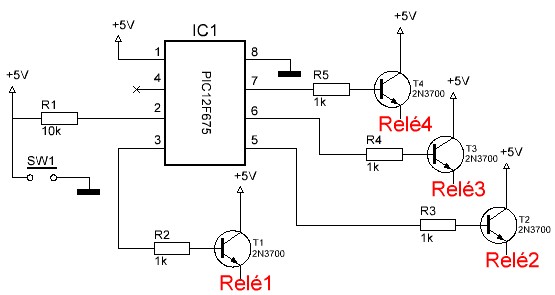 Engem egy olyan kapcsolás érdekelne, ha megnyomok egy nyomógombot elindul egy időzítő és a beállított értékre pl.: 10 perc , kezd el lépegetni 4db relé. Pl.: első relé 10 percig működik, utána ha lekapcsol elindul a második relé 10 percig ..... 4. reléig. Addig ne induljon el míg újra meg nem nyomom a nyomógombot.