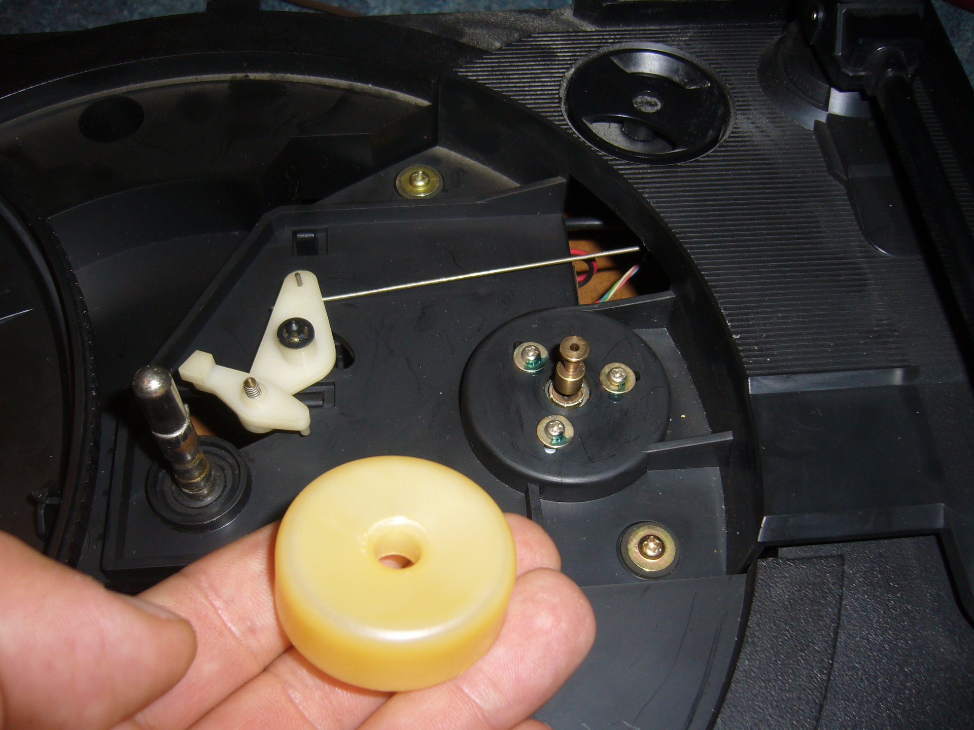 Pl itt van ez, a géphez adták. Ami a kezemben van, az mi? S vajon hová való..? Először azt hittem hogy a kis lemezekhez valami közdarab, de nem az. Szerintem az a fekete az a lemezjátszó testbe süllyesztve. Ez nem az, de akkor ez mi? Akárhová "matekolom" nem adja ki, pedig biztosan hogy "valami", s valahová való.