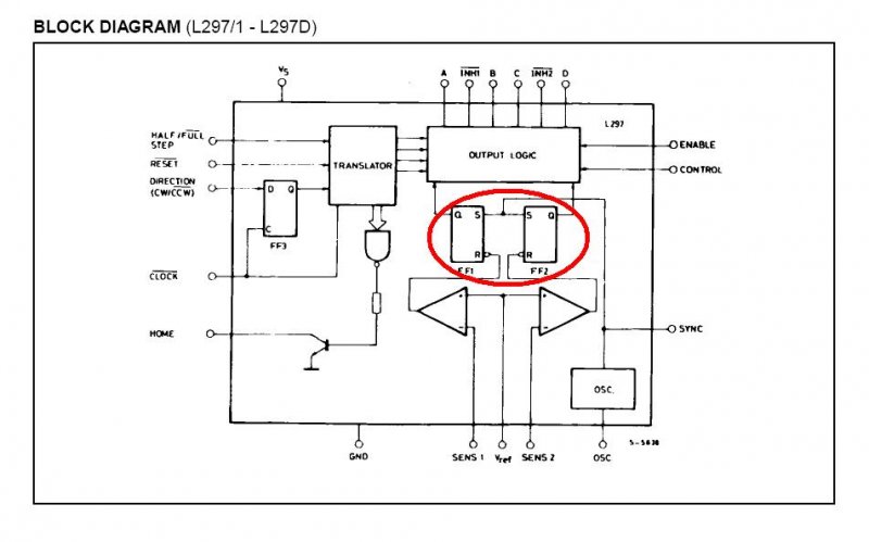 Segítségeteket kérném! Léptető motor vezérlőt tervezek és elakadtam egy résznél! Több vezérlő ic belső felépítését tanulmányozva mindenhol ugyan azzal a megoldással találkoztam és nem igazán értem! Példaként csatoltam az L297 belső felépítését! A pirossal karikázott részben a lényeg! Egy flip-flop ra érkezik a tekercs áramot figyelő komparátor jele és a pwm frekvenciát adó ipulzus sorozat! Kérdésem a köv: miért flip-flop? Miért nem egy sima és kapu? Mi gátolja meg, hogy R és S egyszerre legyen 1? Vagy nem értem az egészet?