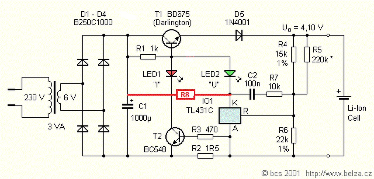 A Belza akkutöltőjét megépítettem, de a töltőáram kicsi (nem a shunt ellenállás által meghatározott értékű, főleg a már töltődő akku esetén). A kapcsolás hibája, hogy a shunt stabilizátor nyugalmi árama (0,5-1 mA) is átfolyik a zöld LED-en, ezáltal leszabályozza a Darlington tranzisztort. A hiba megszüntethető az R8 ellenállás bekötésével, ami bitztosítja az IC nyugalmi áramát (értéke 4,7kOhm lehet.) Az R1 ellenálást 470Ohm-ra cseréltem, hogy a LED-ek jobban világítsanak.