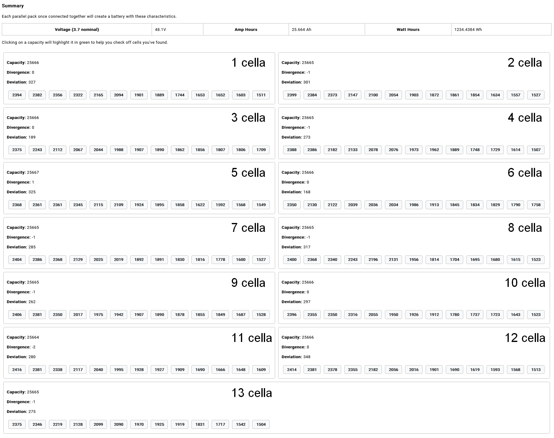 Bízd ezt a számolást a kalkulátorra, az berakja neked úgy, hogy minél azonosabb legyen a kapacitása minden cellablokknak. Minél több van párhuzamosan, annál kisebb lesz a szórás.