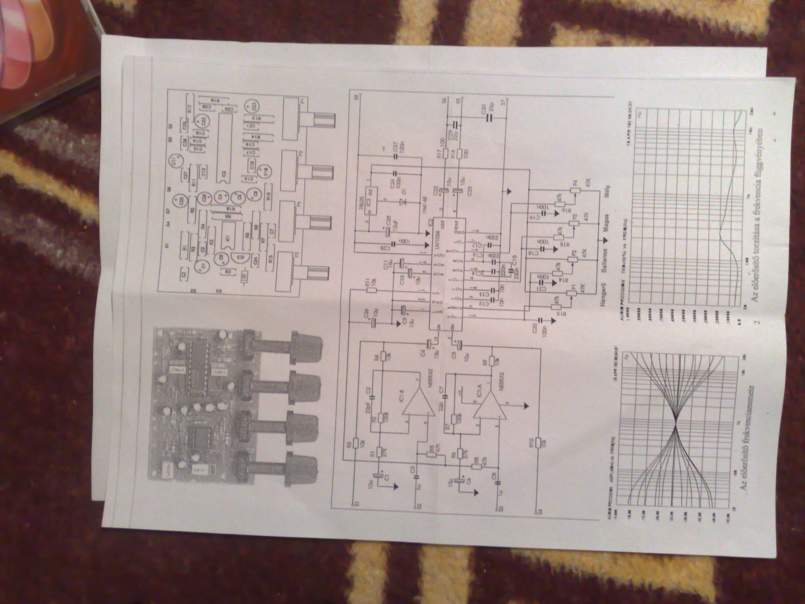 probáltam ilyen univerzális adapterröl is, (4-12V) meg probáltam sima egy roadstar hifiből kiszedett trafóval is egyenirányítás, majd egy 1000µF-os, és egy 100nf-os kondival a föld és + között,, és nem. A bementi kondi nemstimmel, 1u-ot ír, nemtaláltam ilyet értékü kondit a csomagban. Írta hogy az NE5532 kimenetén 5V-ot kell hogy mérjek, hát az nekem nincs ott.