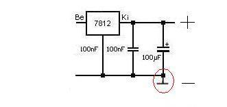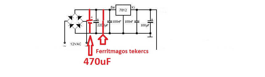 A tekercs úgy nem lesz jó, mert rövidzárat okoz! Sorba kell kötni a pozitív ágban. Egyébként, én nem látom értelmét ennek sem, meg a 2200µF-os elkónak sem. Elég lesz oda 1000uF. A 100n viszont kell az IC mindkét oldalára. A kimenetén sincs szükség 10-47µF-tól nagyobbra. Üdv.