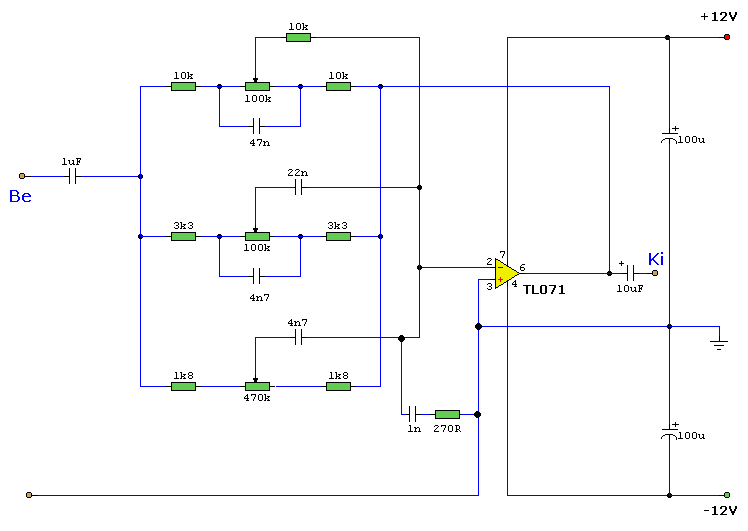 koszonom mindenkinek a segitseget de az en problemam nem a hangszinezoben volt hanem a bemenetvalaszto reszben , azert nem volt mely szinte semmi mert a bemeno kanalisokra egy 100nF kondikat raktam es persze a kimeno csatornara is ,ennek hala mar a bemenetvalaszo levagta a mely tartomanyt a 100nF kondik miatt , a hagyomanyos hangszinesovel tokeletesen meg vagyok elegedve , minden igenyemet kielegiti csak eggyet nem az alapzajt kiveve mert a tl071 es ic-k nek is elegge nagy a zaja , de szerencsemre talaltam itthol egy C4570HA tipusu ic-t amivel tokeletesen lehet helyetesiteni a tl-t es a zaj szempontjabol a legjobb , semmi nincs neki ,, ha mar liba akkor legyen zsiros,,