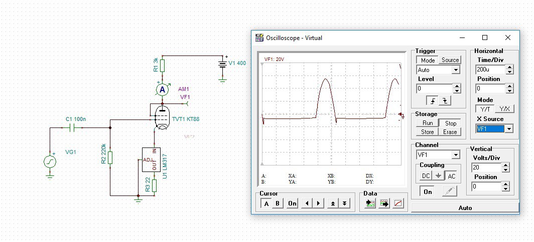 A kérdező azt az alapvető dolgot hagyta figyelmen kívül, hogy a csövön nem csak egyenáram folyik hanem a vezérlés árama is, ami érdekesen fog kinézni ha az áramgenerátor ott van.