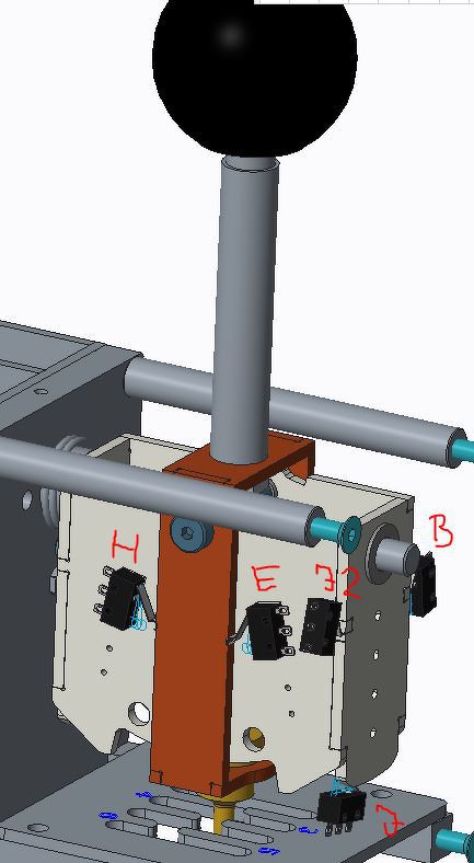 Egy autós szimulátorokhoz használatos H-váltó építésébe fogtam, a gépészeti rész gyakorlatilag kész van, viszont az elektronikával bajban vagyok, ebben kérem a segítségeteket! Az elektronika alapja egy régi, 8 gombos joystick lesz, aminek a 8 digitális bemenete tökéletesen alkalmas lesz arra, hogy a váltó 8 pozícióját érzékelje. A csavar ott van, hogy én a 8 pozíciót 5 db mikrokapcsolóval szeretném érzékelni, az első két képen látható módon. Az első kép a mikrokapcsolók fizikai elhelyezkedését mutatja a 3D-s modellben, a második képen lévő vázlat pedig a működést hivatott bemutatni. Az "E" és "H" jelű kapcsoló érzékeli, hogy előre, vagy hátra van tolva a váltókar, "B" ha balra van húzva, "J", ha jobbra, "J2" ha teljesen jobbra, a 7-8-as pozíciókhoz. Ezek alapján egyértelműen meghatározható a váltókar helyzete, azaz hogy melyik fokozatban van és hogy melyik pin-re kell küldeni a +5V-os jelet. A mikrokapcsolók 3 lábúak, tehát az egyik felét megszakítja, a másikat összezárja kapcsolásnál. Az első kérdésem, hogy létezik-e olyan kapcsolás amivel relék, tranzisztorok nélkül, egyszerű vezetékezéssel meg lehet oldani a feladatot? Én hiába firkáltam órákig, nem sikerült ilyet kitalálni, szóval úgy sejtem, hogy nem úszom meg valami vezérlés fabrikálása nélkül. Egy relés, vagy tranzisztoros vezérlést talán össze tudok hozni, kérdés, hogy mi az egyszerűbb, milyen alkatrészekben gondolkozzak, amivel a legolcsóbban, legegyszerűbben meg lehet oldani a feladatot? Köszi a segítséget előre is!