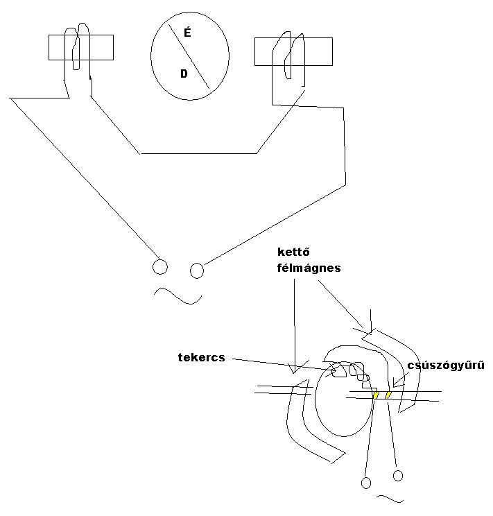 Ha a tekercs direktben, kapná az egyenáramot, akkor megmoccanna, és a forgórész Északi tekecse, az állórész Déli pólusához beálna, és ott tartaná magát! A kommutátor, azt teszi lehetővé, hogy a tekercsebn fentartsa az állandó áramirányváltozást, így a motor, morog, és nem egyhelyben forog tovább! Amikor az egyenáram a kefékhez ér, addig még egyen áram, viszont a komutátor oldja meg hogy a polaritás megváltozzon annak érdekében hogy a motor forgórésze "mozgásba jöjjön"! A képen láthatod, hogy a váltakozó áramú motort, hogyan lehetne ezt elkészíteni!