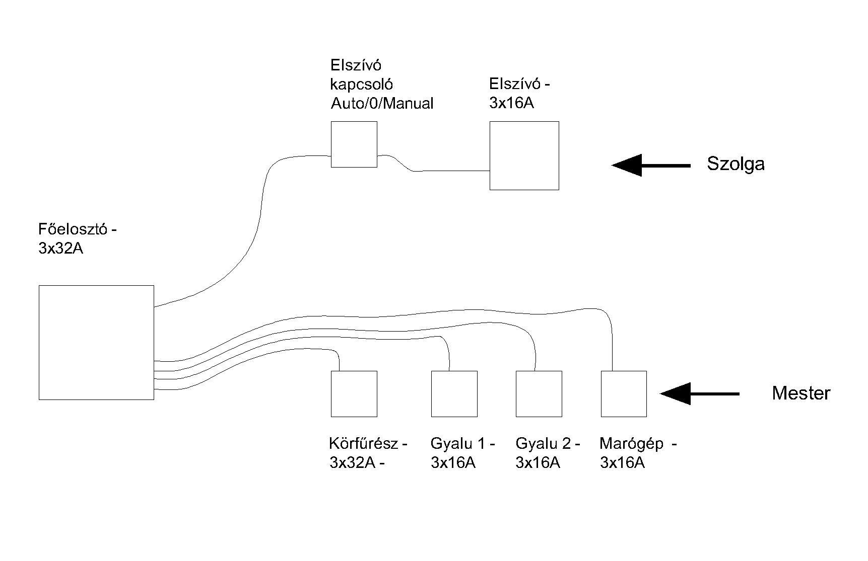Az asztalosműhelyembe egy master/slave irányítást szeretnék beépíteni. Adott négy darab 3 fázisú ipari gép (ezek lennének a mesterek) és egy 3 fázisú elszívó (1,5 kW teljesítmény, ez lenne a szolga). A főelosztóba szeretném beépíteni a vezérlését ennek a rendszernek. A neten való keresgélésem nem járt sikerrel. Leginkább egyfázisú rendszerre találtam megoldást. Az esetemet még az is nehezíti, hogy itt négy mester van. Mivel magam dolgozom a műhelyben kicsi a valószínűsége még, hogy egyszerre van használatban több mester, de a jövőben ez is változhat. Az elszívónak a mester leállása után késleltetve kell leállnia, kb. 5-6 mp múltával. Milyen megoldást javasoltok ennek a rendszernek az irányítástechnikájára? Az elszívót eddig egy tokozott motorindítóról indítottam külön. Ebbe is bele kéne nyúlni (vészleállító, 3 állású kapcsoló (Auto, kikapcs, manual)). Mennyire bonyolult egy ilyen rendszert megépíteni? Csatolok egy blokkrajzot, hogy világos legyen ez az egyszerű elvi kapcsolás. Segítségeteket előre köszönöm! Üdv, J A hozzászólás módosítva: Dec 13, 2023
