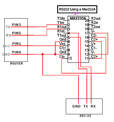 Nekem nem jött le a hozzászólásaidból, hogy a MAX233 hány voltról működik. Mert ha csak 3.3V-ról megy, akkor a kimenetek kisebb feszültséget vesznek fel(-6..6V) mint a szabvány, ezt lehet, hogy a te SSC-32-nek kevés.