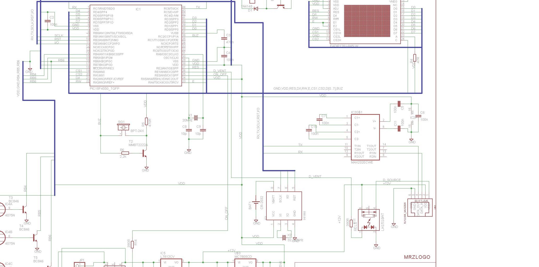 Most próbálkozom először RS232 kommunikációval 2 PIC között. Egy kéziműszer és egy detektor egységről van szó. Csatoltam a kéziműszer kapcsolását, a detektor kapcsolása hasonló, csak nyilván a TX/RX vonalak bekötése fordított (Tx az ellenoldal RX-hez és viszont) Szintillesztőnek MAX232-t használok, amint a rajzon is látható. A programokat CCS C-ben írtam