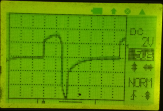 ezzel -2.5V-tól -7.5V-ig tudom szabályozni a kimenő feszültséget. A bemenő feszültség csak a töltési jelalakot változtatja. (2db DSO 068-al készült kép, tapintó a dióda katódja ill az IC 2-es lábon.)