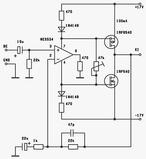 Ja igen. A jó öreg "fatengelyes" komplementer-szimmetrikus kapcsolás. Semmi különös nincs a "100Khz" es sávszélességben és szerintem ez még kifejezetten átlagos paraméter. Egyébként sincs közvetlenül kapcsolatba az erősítő minőségével. Rakhatok fel olyan erősítőt is, ami DC-1Mhz teljesítmény sávszélességgel rendelkezik, nincs abban sem sok kunszt. Mindössze megfelelően magas vezérlőáramra kell méretezni a feszültségerősítő fokozatot és minél kisebb szórt kapacitásra a terhelését (ezzel tudjuk emelni az erősítés-sávszélesség szorzatot). Gyors végtranyókat kell alkalmazni és biztosítani kell a B-E kellően gyors lezárását, valamint pontosan ki kell számolni a (magasra feltolt) második törésponti frekinél lévő nyílthurkú fázistolást és biztosítani a kellő fázistartalékot (ezt a nehéz