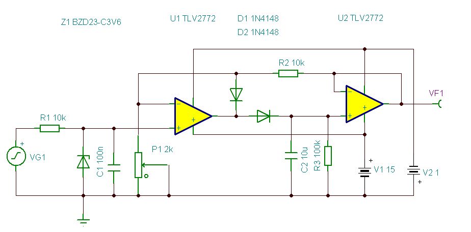 Na össze kalapáltam neked két rajzot. - A negatív táp csak azért kellett, mert a Tinában nekem nincs LM324, vagy LM358. - A második megoldás azért jobb, mert kisimpedanciás a kimenet. - Próbáld ki ha van lehetőséged, szerintem menni fog, kis analóg hibákkal. - A 10µF és 100kohm-al az időállandót állíthatod be. Ha az IC bemeneti árama gondot okozna, (ha nulla benetnél nagyobb akimeneti fesz mint gondolnád) az ellenállást csökkenteni kell. - Potival beállíthatod 1V-ra a kimenőfeszt 10Vdc-re. (Mondjuk nem írtad, hogy a bemenőfesz effektív, vagy csúcs 1V, de mindegy.) üdv! proli007