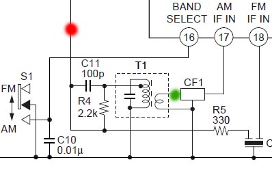 Csatoltam az elrendezést. A rajzon van más is, mert a CXA ic adatlapjából vágtam ki, de gondolom nem probléma. Szóval a pirossal jelölt rész a bemenet (MC3362 5. láb), a zölddel jelölt pedig a kimenet. A zöld pontot én egy 1,8 nF-os kerámia kondival kötöttem rá az IC 7-es lábára. A 2,2 kohmos és a 100 pF-os kondit is bekötöttem, nemtudom mennyire szükségesek.