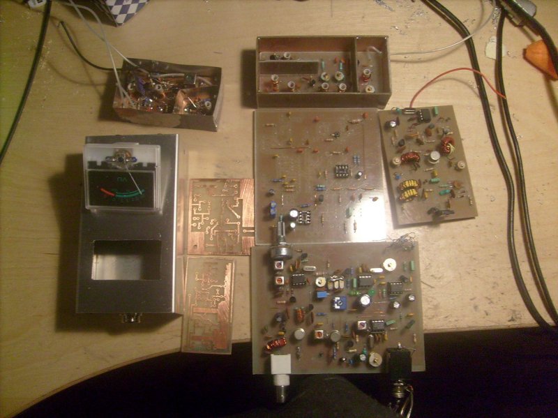 Megerkezett a csomag Kinabol, szepen rendben alufoliaba, majd polimerbe agyazva itt az MC3362. Szinten lett egy MC12054-em elooszto gyanant tervezem a frekimero ele, mivel LCD-s radiot sehol nem talaltam. Kicsit elore menekulesert nekialltam egy URH GDO nak es egy hangolo oszcillatornak is. A ket uj nyak kozul a kisebb az oszci modulatorral, a nagyobb az enyhen modositott GDO nyak. A francia radio a kepen kozepen meg csak felkesz, a muszerekre koncentralok, aztan megprobalom beloni a tunert is. Jobbra van egy taviro adovevo es egy masik ado fokoztat. Mindennek van doboza is. Sajnos 10,7 M es 455 k szuroim meg nincsenek, meg fog allni a francia radioepites ennel a pontnal par hetre... Ha valami elkeszul jenetkezem. Koszonom a tanacsot a nyakkal, a tuner mar abban lakik. Udv Joe Kepek minosege.. sajnos elszallt a vakum