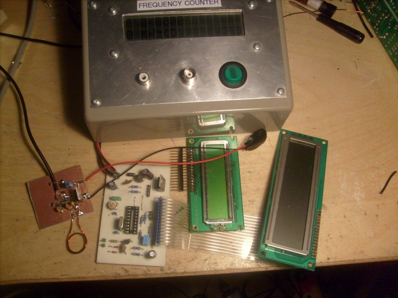 Ha pici szinusz jelet kap az oszto, kimeneten oszcilloszkoppal nezve negyszog jel van, a doksiban garantalt mukodesi ablak nagyobb, tehat az en osztom 5 megatol lefel siman oszt, ezert is nem akartam kiegesziten extra 74 es Ic kel, szerencsem volt a 6.25 os kvarcal. Ha a sokszorozo rezgokorere teszem a hurkot, picit maszik a freki(irjak a doksiban), ebbol tudom keves a jel, de ahogy hangolom a magot rezonancia eseten szuperul stabil a jel: Hangolni tudtam a koroket frekimerore... Jol merte a 12 szeres frekit, tehat sokszorozo jo, oszto frekimero jo, aminek orultem. Az LCD-k kozul nekem mindennel( 1 sor 2 sor 4 sor 16/20 karakter),indult, de ket soros LCD nel eltolja ket sorba az informaciot, ugy, hogy 6 digit folul van 4 alul, ami megszokhato, nekem igy megy az egyik muszer, mert nagyszmjegyu kijelzo volt olcson sok.Termeszetesen a hozza valot erdemes beszerezni ha amugy nincs ingyen mas. :integet2: A kepen lathato az oszto a sokszorozoval egy hurokkal siman mer, 4 pF csatolo kondival rezgokorrol szinten. Semmi nem gatol immar a tuner hangolasaban, de biztos kell a sikerhez par nap Azert ha az so42p aramkor elindul holnap, csak sikerul az idei fogadalom... Udv Mindekinek A frekimero nyakja, ua van belul, csak ic is van benne...