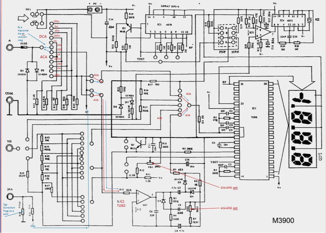 Sziasztok!Régóta bogarászok a fórumon de először próbálok hozzá szólni.Látom,hogy a Metex M-3800-ról többször is érdeklődtek.Nekem is van kettő.Nekem adták mert halottak voltak.Az egyiket már felélesztettem.A tokban a kis nyolc lábu IC (gyári-062d) megfelelője (TL062) az LCD meghajtó helyett pedig ICL7106 jó bele.Igazából mind a 4 IC-t kicseréltem és egyből jól működött.A tranzisztor vizsgáló dugalj melletti potival kell beállítani az áram mérést,minél kisebb méréstartományban annál pontosabb,gongolom én mert én is csak egy (amatőr-ke) vagyok.Az M-3900 rajzát össze vetve az M-3800-al és a panellal nekem ugy tűnik,hogy a kettő kombinációja az M-3800.Az M-3900-as rajzán megvannak az alkatrészek értékei is,sőt szrintem ugyan az a kettő.Az M-3900-as rajz kulturáltabb és teljesebb.Remélem nem tulságosan késtem el az irományommal.