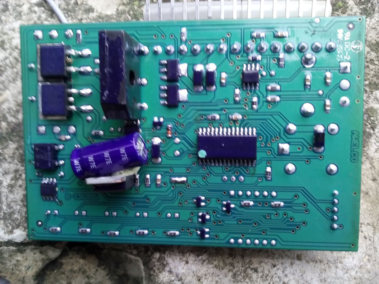 A végtranzisztor vagy fet a forrasztási oldal felől nézve a ball felső sarokban található 2 db fekete kocka a panelra ráforrasztva.