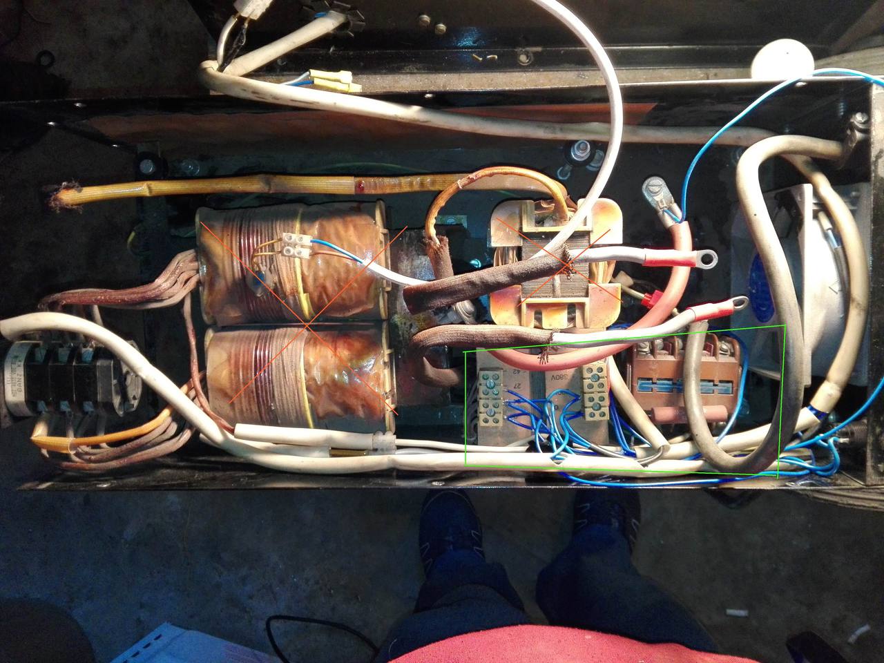 Az átalakítást úgy képzelem (4,kép), hogy a piros x el jelölt trafókat likvidálom a szerkezetből, a zölddel bekeretezettek maradnak. Az inverternek adok áramot a főkapcsolóról, a munkakábel felé menő kábelnek meg beépítek egy bivaly mágneskapcsolót. Működhet ez így?