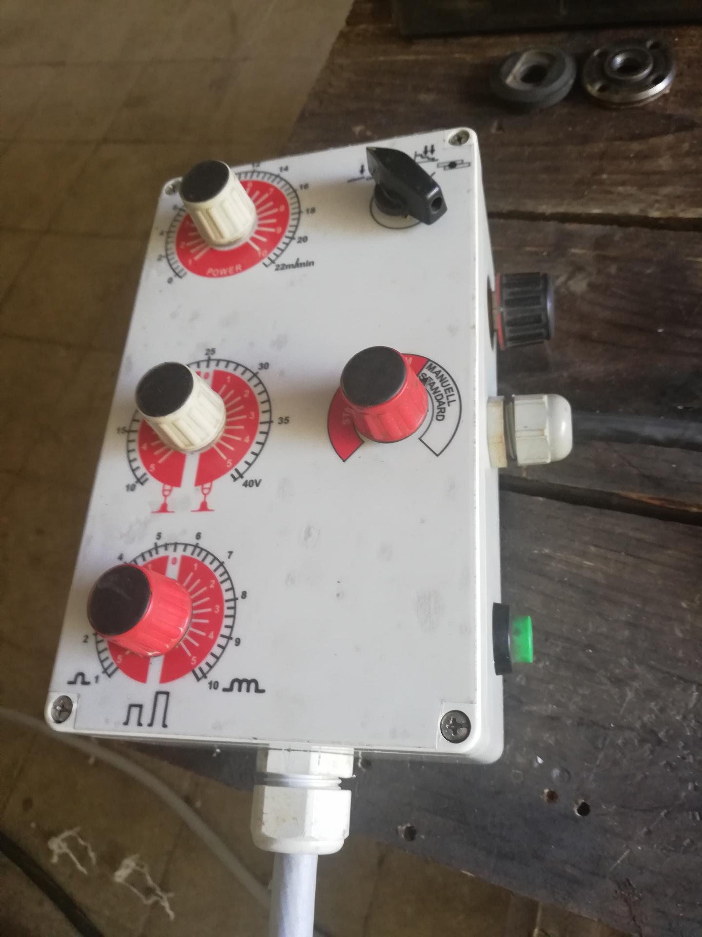 A próbahegesztés megtörtént. Nagyon könnyű beállítani. Holnap még felteszem a burkolatokat, stb. Kifestem az előlapon lévő feliratokat, fúrok pár lyukat hogy a ventilátornak legyen honnan szívnia a levegőt, beállítom a nyomás kapcsolót valahogy kétszínűre, lábat csavarozok rá, bár ezt még meglátom. Lehet kocsi lesz neki.
