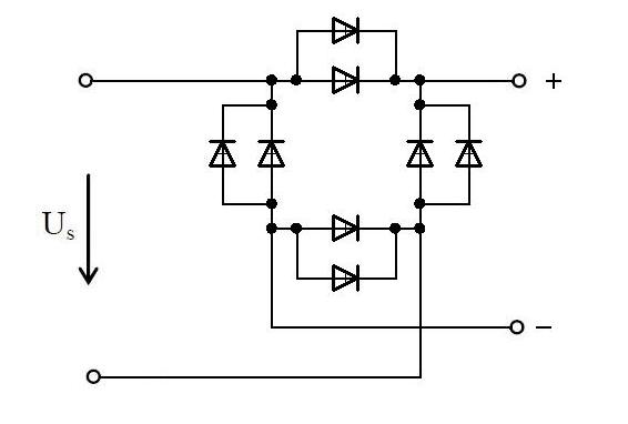 Tehát egyfázisú trafód van és graetz kapcsolású egyenirányítót kell építened. Az alábbi elrendezésben kell bekötnöd a diódákat egy-egy db párhuzamosan és úgy hídba. Generátor diódáknál alaposan nézd meg, melyik a diódák anódja és katódja.