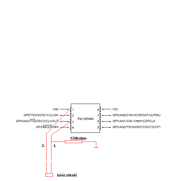 Adott egy 12F683-as áramkör. Aminek a GP4 analóg bemenetére megy egy hőérzékelő szenzor. Ez a szenzor kb. 5 méterre van a PIC-től, sajnos sima 2 eres kábelt használtam (nincs árnyékolás) Utólag nem tudom módosítani. Ha nincs összekötve a pic-el akkor 17V ac-t lehet mérni a földhöz képest az 1. ill 2. pontokon. Ha bekötöm a pic-t természetesen megszűnik, de még mindig zavarja időnként valami, mert ha leterhelem az 1-2 pontot a pic közelében akkor zavarmentes, viszont a mérése torzul Van valakinek ötlete mi lehet a megoldás? A 100 nanos kondi a Vdd- Vss lábakon van. Üdv
