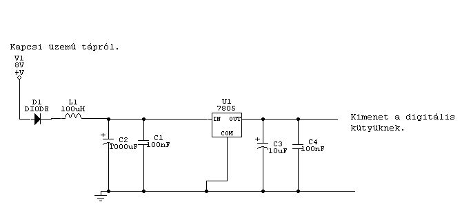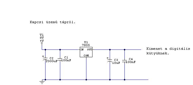 Megrajzoltam, így van megoldva a táp. (Ha én hozzáérek az Ák valamelyik pontjához, akkor olyan mintha lefagyna az egész. Mintha megállna a PIC-nél az oszcillátor, de a 40XX IC-k is bekattannak.)