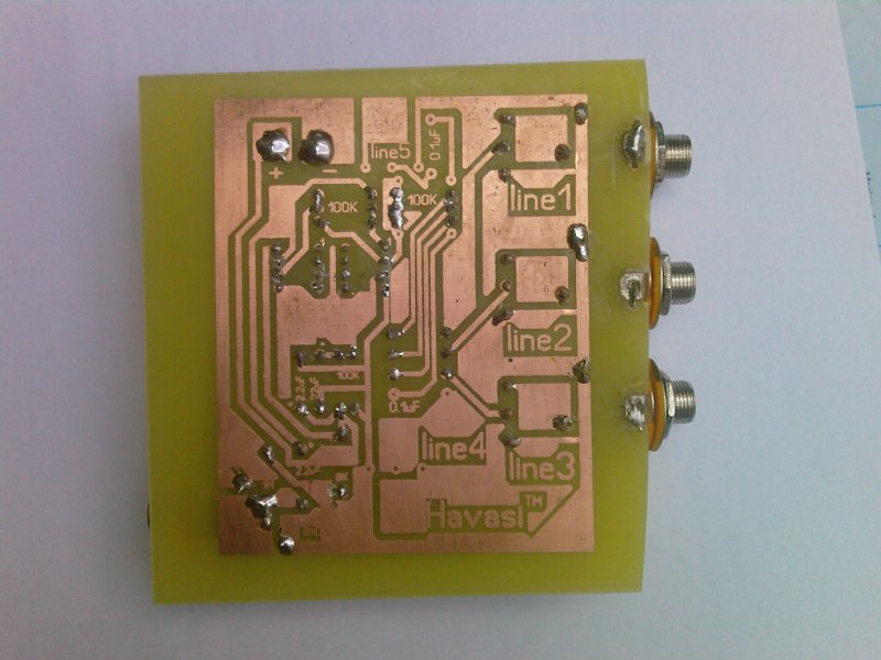 Szerintem van már ilyen topik. Az abban levő keverők is nagyjából ilyen felépítésűek, szerintem ez is működne. Egy műveleti erősítős összegző meg egy erősítő fokozat ha jól nézem ez is.