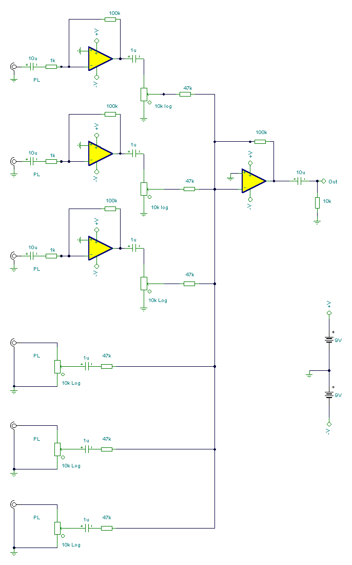 itt egy hasonlóan egyszerű keverő rajza, ezen 6 csatorna van 3 érzékenyebb és 3 kevésbé érzékeny