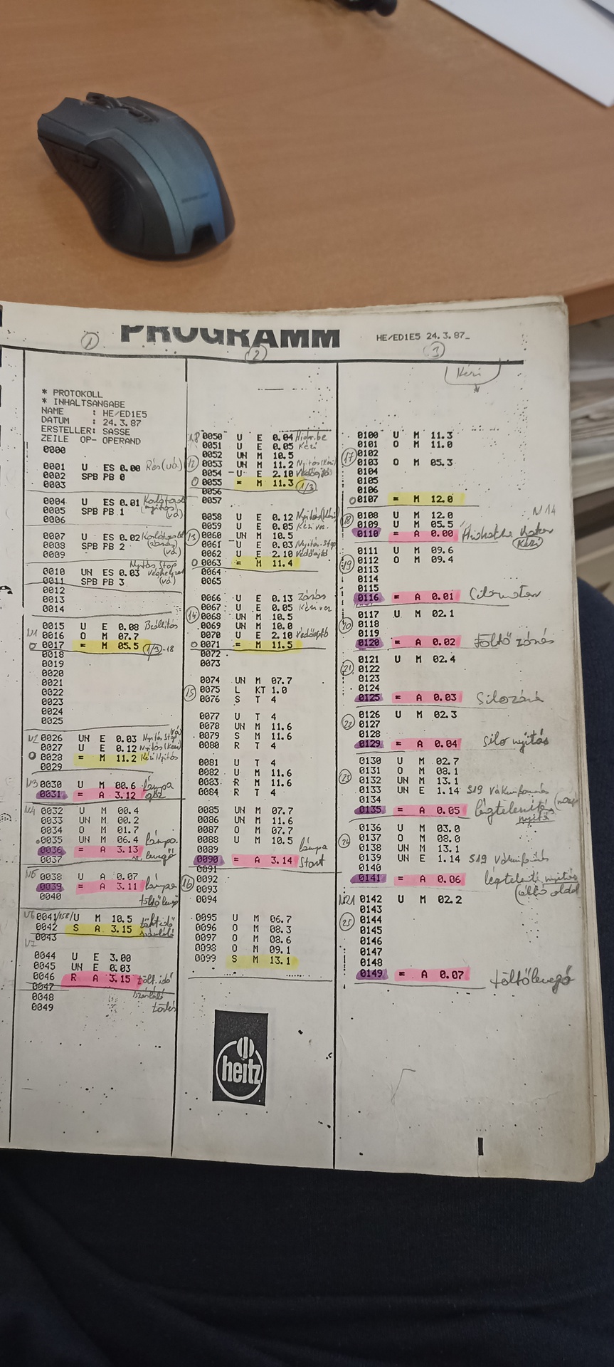 A fent említett eszköz programkód értelmezésében valaki tudna segíteni ? Nem találkoztam korábban ezzel a formával. Az E.xxx bemenet, A.xxx kimenet, M.xxx az merkert jelent, a többi jelölés jelentését nem tudom. A mellékelt leírás alapján nem találtam eddig hasznos információt.
