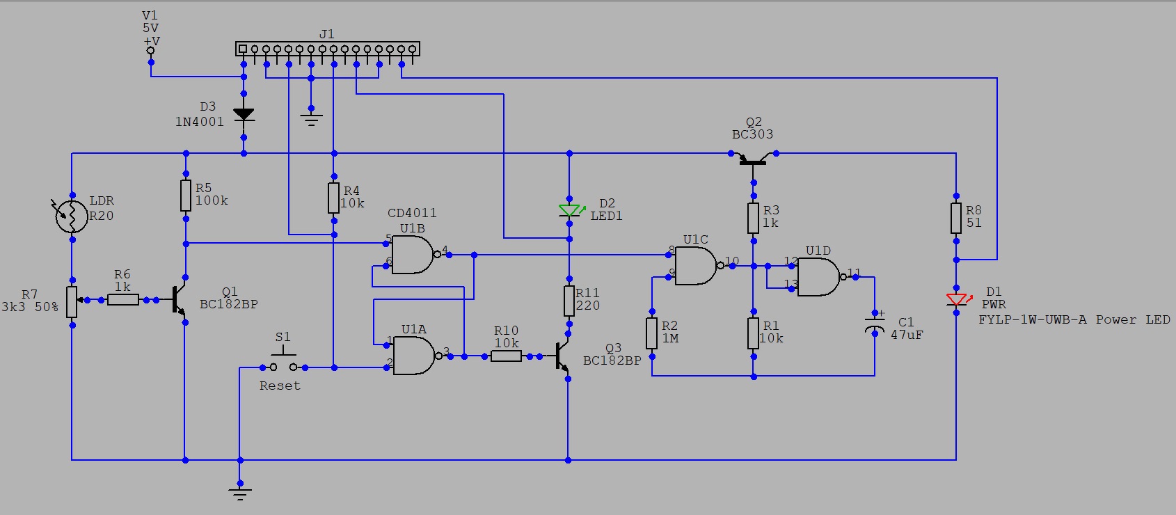 A működése: A kapcsolás lelke egy fényérzékeny ellenállás (LDR). A Q1 tranzisztoros fokozat biztosítja a kapcsoló jelet a következő fokozatnak, mely tulajdonképpen egy NAND kapukból (U1A-U1B) kialakított RS tároló. Sötétben LDR ellenállása kb. 500 kohm, világosban 100 ohm alatt van. Az LDR és az R7 potenciométer feszültségosztót alkot. R7-tel lehet az áramkör érzékenységét egy kicsit állítani. Ha fény éri az LDR-t, nyitja Q1-et, az RS tárolót SET állásba billenti (negált jellel). Ez a tároló biztosítja, hogy a hívásjelzés mindaddig aktív maradjon, amíg az S1 „Reset” gombot meg nem nyomod. A Q3 tranzisztoros fokozat D2 LED-et működteti, mely az áramkör készenlétet mutatja. A CD4011-es IC másik két kapuja (U1C-U1D) a Q2 PNP tranzisztoron át villogtatja a jelző power LED-et kb. 1Hz-el. A villogás gyorsasága C1 és R1 változtatásával lehetséges (próbálgatás). Q2 tranzisztor 1A-rel terhelhető (BC303, ilyenem volt...). Az általam használt power LED 1W-os, max. 350mA áramot vesz fel. Q2 fémház tokozású, a power LED pedig nem világít teljes erősséggel és az is villog, ezért a tranzisztort nem szükséges hűtőbordára rakni, a power LED-et viszont nem árt! A LED helyett használhatsz valami berregőt is.