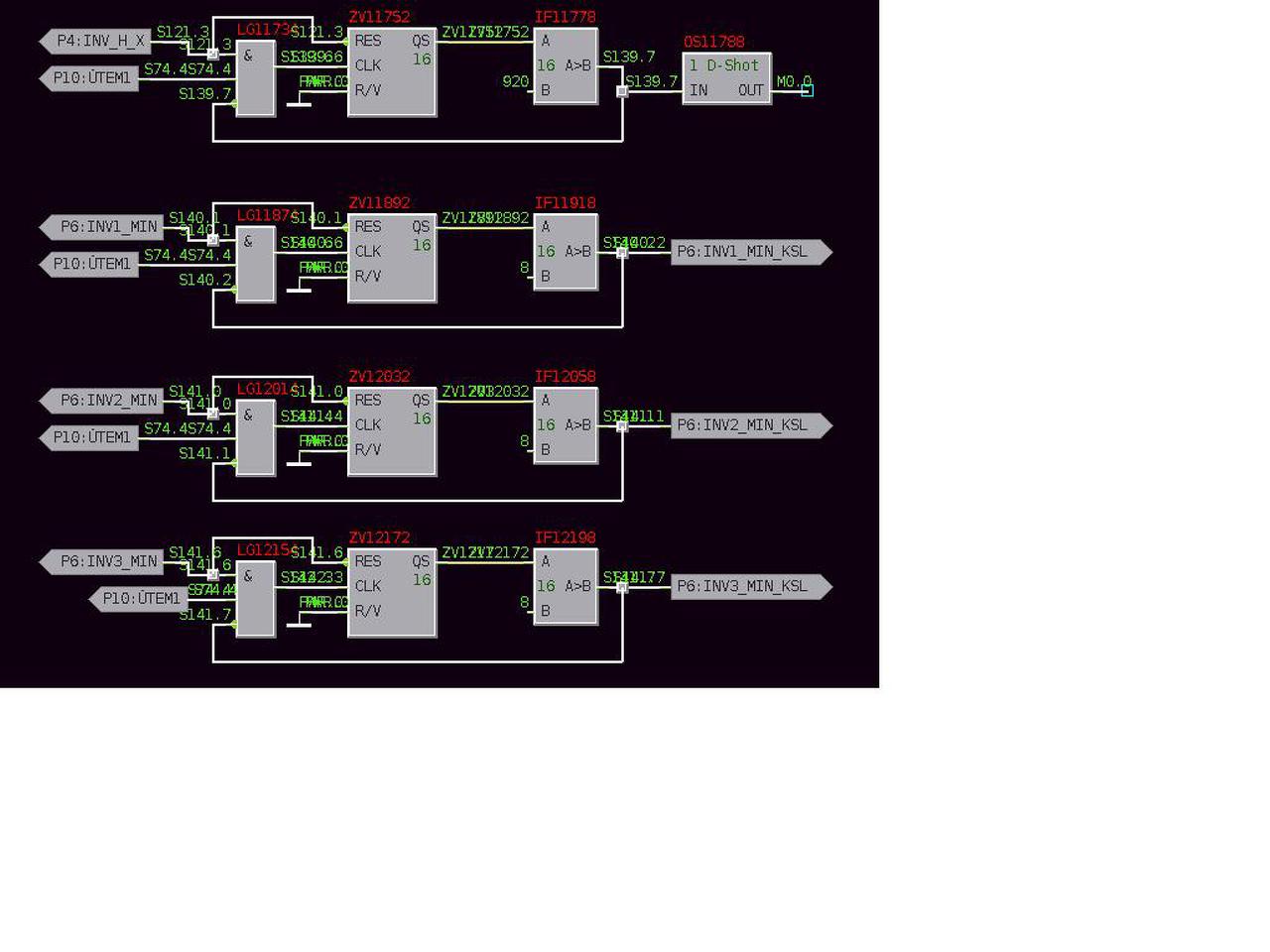 Az időzítések helyett használj a mellékelt módon számlálókkal. Ebből akár 20-30db-ot is használhatsz. Az ütem az célszerűen 100ms. Így nem zavarják egymást. Az áramkört és a programot kisebb részletekben próbáld ki, akár egy bemenet és egy kimenet kapcsolatát. Aztán ha ez megy, akkor variáld időzítéssel, aztán többel...stb. Lehet rajzolni több oldalon és zászlóval összekötni. (Én is ilyenből ollóztam ki) Az one-shot egymást nem indítja biztonságosan, ha többet kötsz egymás után. Kivéve ha a második invertált. ("gombócos")Ebben az esetben bekapcsoláskor ezek adnak impulzust. Ha zavaró, akkor meg kell kapuzni és egy késleltetéssel szabaddá tenni 1-2 tized után...stb... A bemenetet fogadó pontnak is invertáltnak kell lennie a Te esetedben, mert ez az aktív állapot, ha az opto bekapcsol...Egyenlőre ennyi...Hajrá!!! A hozzászólás módosítva: Júl 14, 2016