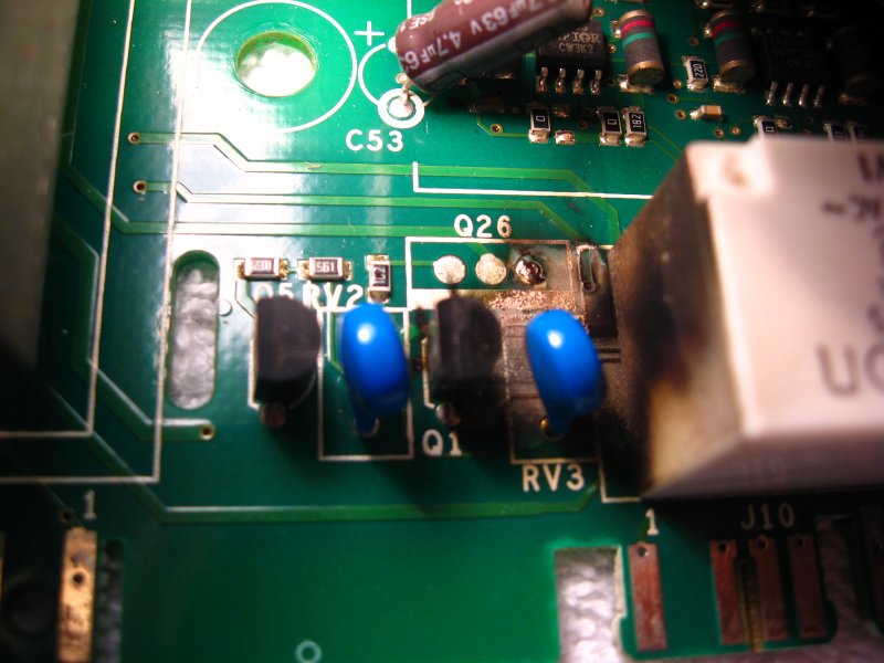 Hello! Küldöm a vezérlőpanel képét. Két helyen látható égésnyom. A bal oldalon, szerintem, csak egy híd égett meg, viszont középen lent, nem tudom, hogy micsoda...