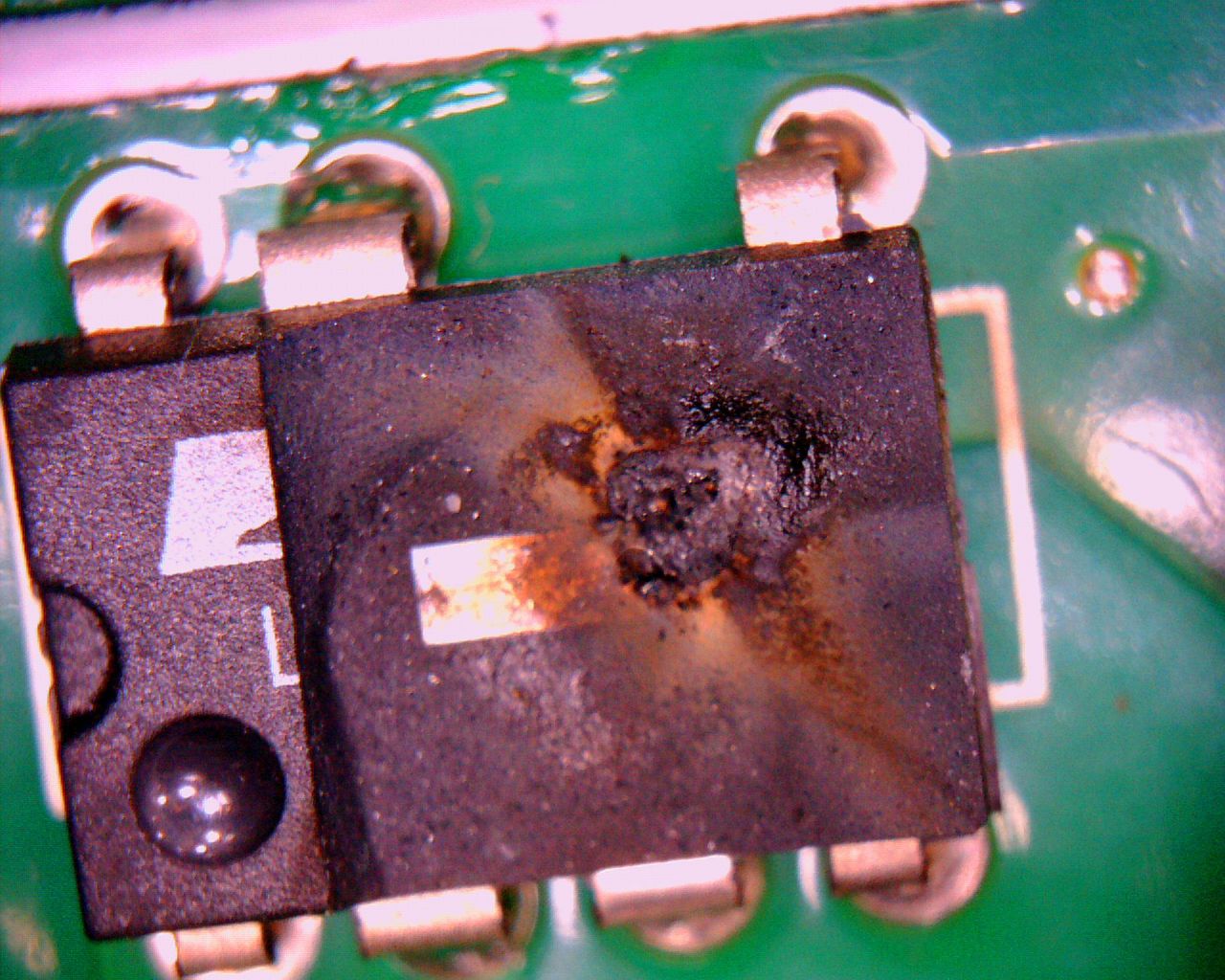 L003 számú áramköri elem. Aminek még a bele is kifolyt.