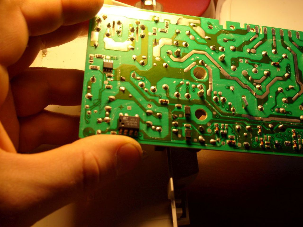 Zanussi ZWQ5100-ás mosógép panelje semmire nem reagál. A panelt a tokozatból kiszedtem, és az első képen látható kormot találtam. A panelt megfordítva (kimérve a távolságokat), a hüvelykujjamnál található alkatrészre esik a hiba ami a zárlat miatt tönkrement.