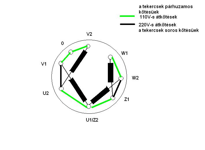 Igen négy tekercs van benne, de úgy, hogy a tekercs felét is kivezették (110/220V), azért van ez így. Itt van róla bővebb eszmecsere. Ha nem menne a dolog, akkor majd berajzolom az általad küldött képre a bekötést. Segítségnek itt a belső elrendezése a tekercseknek. V2-U2 átkötés V1-U1/Z2 (ez így a főfázis tekercs), a többi a segédfázishoz tartozik.