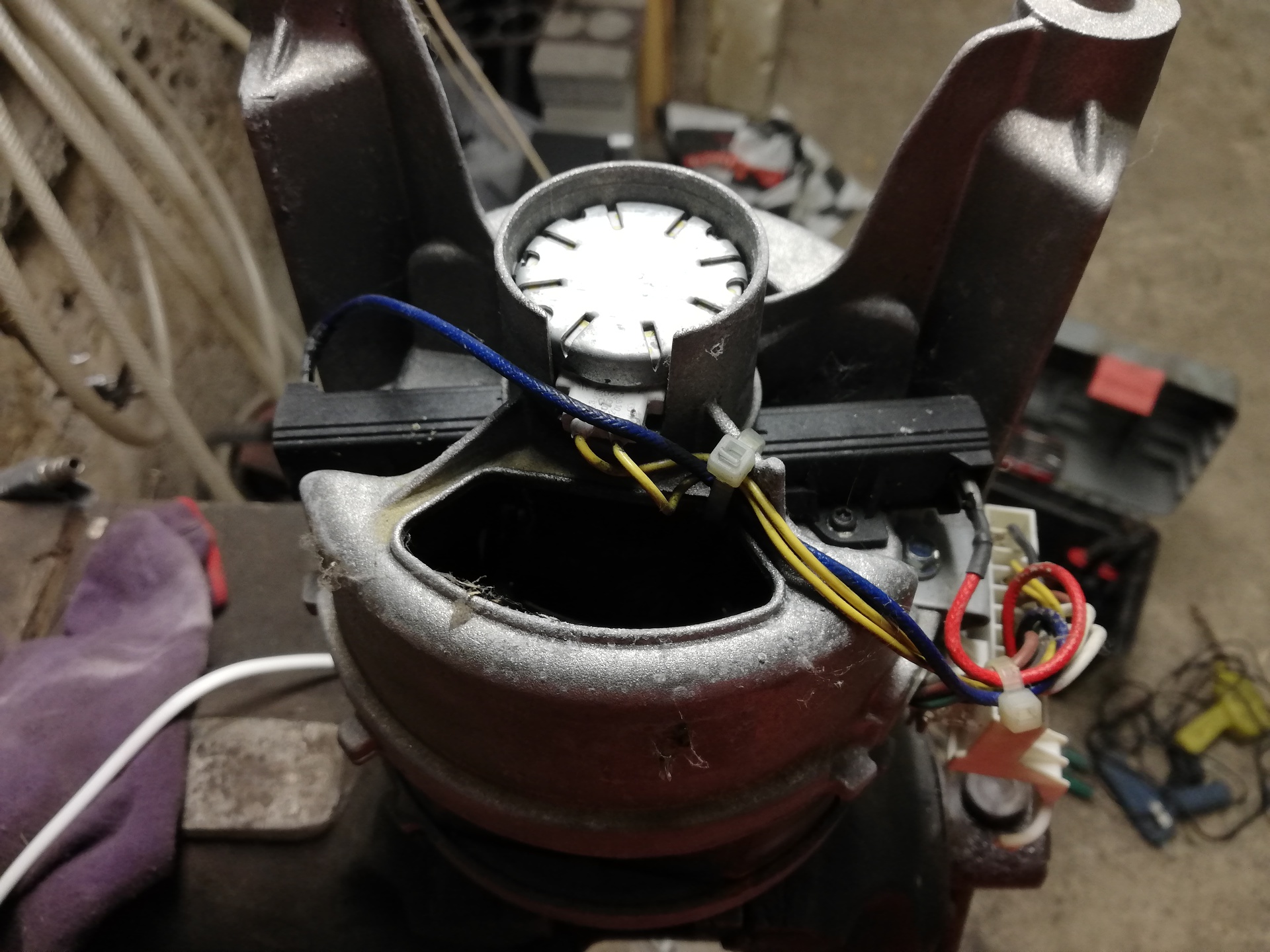 Sziasztok. Zajossá vált a képen latható Electrolux mosogép motorja. Csapágyakat kell cserelnem. A motort szegecsek tartják össze, majd lefúrom őket. Ami gondot okoz: az ékszíj tárcsa nem jön le, csapágylehúzó nem mozdítja. Megfogom próbálni hőlégfúvóval megmelegíteni. A tengely hátsó végén valami szenzor van? Válaszokat előre is köszönöm.