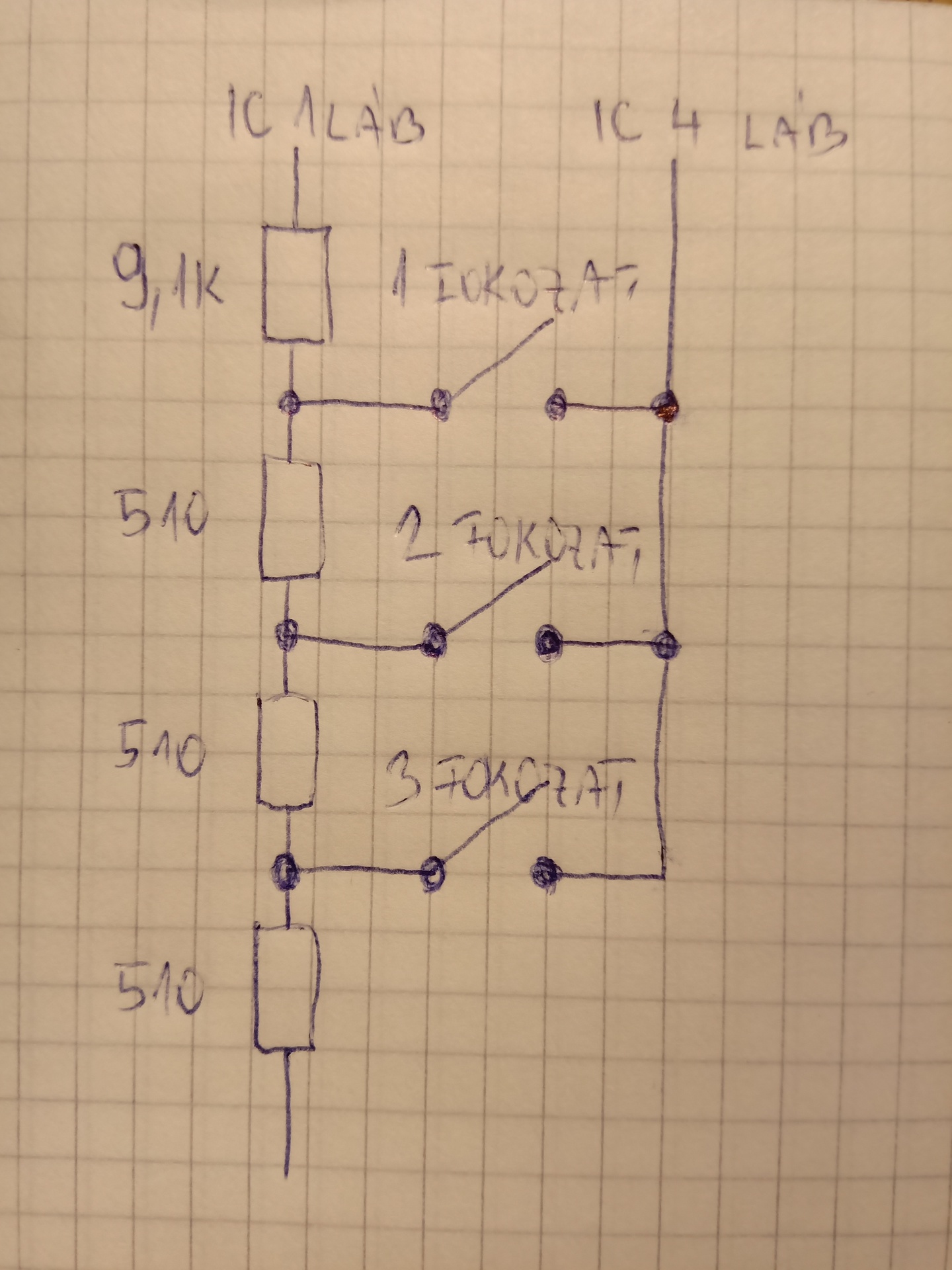 Köszi! Az a baj,hogy a három kapcsolót egyetlen nyomó gombbal kellene helyettesítenem,hogy azzal tudjam a fokozatokat váltani. Azt mondták,hogy nagyon kis hely áll rendelkezésre, ezért is nem lehet potméteresre csinálni, különben már megoldottam volna. Így a kapcsolókat sem tudom beépíteni.